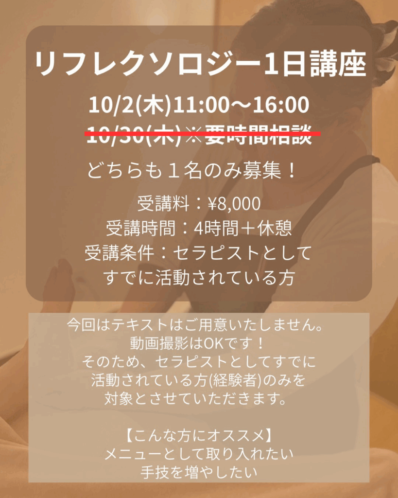 10月2日(木)に開催予定の「リフレクソロジー1日講座」では、現在1名さまを募集中です。