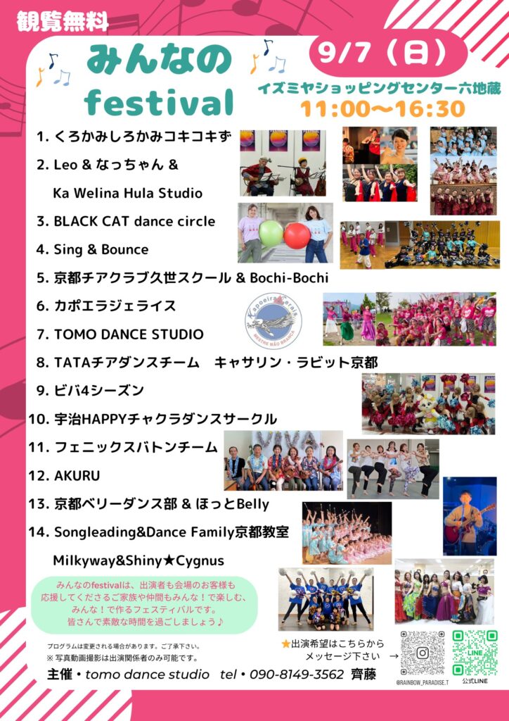 地域で活動するダンス・音楽チームが一堂に会する「みんなのfestival」が、9月7日(日)にイズミヤショッピングセンター六地蔵にて開催されます!